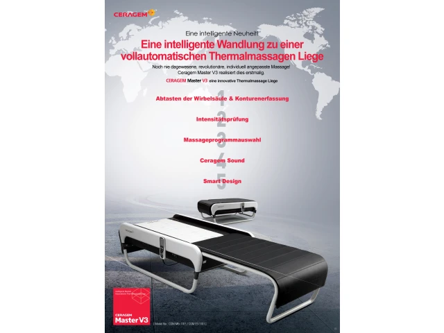 Eine gesunde Wirbelsäule ist der Schlüssel für einen rundum gesunden Körper und dies zu erreichen, ist die Herausforderung für jeden einzelnen, der ein gesundes und glückliches Leben anstrebt. Medizinische Therapieliege „CERAGEM Master V3“ verbindet moderne Technik und jahrhundertealte, fernöstliche Medizin und bietet Ihnen so die Möglichkeit, bequem Ihre Wirbelsäulengesundheit zu optimieren - ganz einfach im Liegen, von Zuhause aus und ohne Vorkenntnisse in Orthopädie oder Osteopathie. Nehmen Sie Kontakt mit unserem kompetenten Team auf und überzeugen Sie sich selbst von unserer Therapieliege, so wie es schon 5000 Kunden vor Ihnen getan haben.